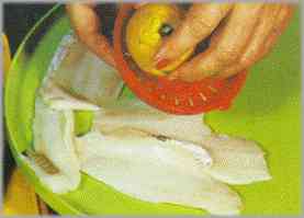 1. Poner los filetes de pescado en un plato y regarlos con el zumo de limón. Salarlos convenientemente.