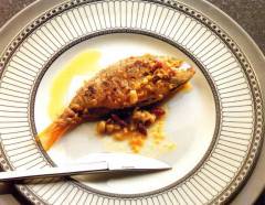 4. Cuando el besugo esté bien asado, colocarlo en una fuente y rociarlo todo con el sofrito de la sartén. Servir enseguida, bien caliente.