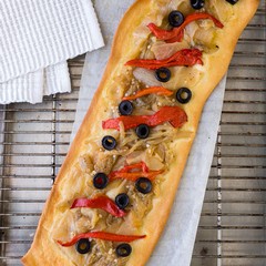 8. Estira La masa hasta que tenga 5 mm de grosor. Píntala con aceite de oliva. Coloca encima las verduras asadas y las aceitunas cortadas en rodajas.